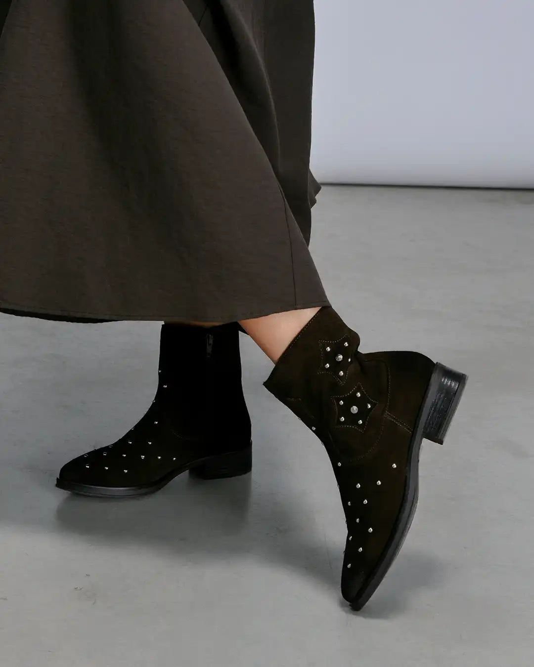 Este botín de piel negro es pura actitud: un diseño con carácter que combina la elegancia del cue...