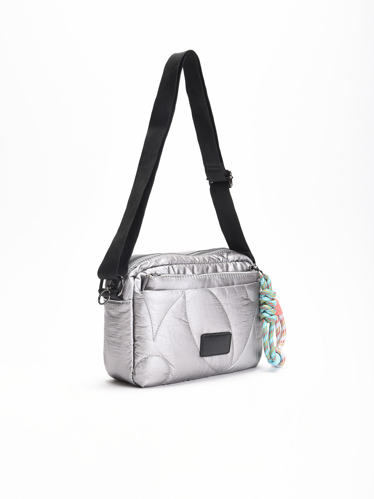 El bolso bandolera plata acolchado es la opción perfecta para quienes buscan un accesorio práctico, moderno y con un toque diferente. Confeccionado en material textil satinado de efecto metálico, destaca por su diseño ligero y versátil. Incorpora un neceser extraíble con asa trenzada multicolor que puedes usar como clutch independiente o como complemento dentro del bolso.